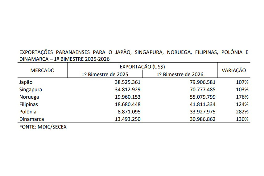 As exportações paranaenses para alguns mercados asiáticos e europeus cresceram de forma significativa neste ano. De acordo com dados do Ministério do Desenvolvimento, Indústria, Comércio e Serviços (MDIC), organizados pelo Instituto Paranaense de Desenvolvimento Econômico e Social (Ipardes), as vendas estaduais para Japão, Singapura e Filipinas avançaram, respectivamente, 107%, 103% e 124% no 1º bimestre de 2026, em comparação a idêntico período de 2025. Ou seja, dobraram de tamanho.